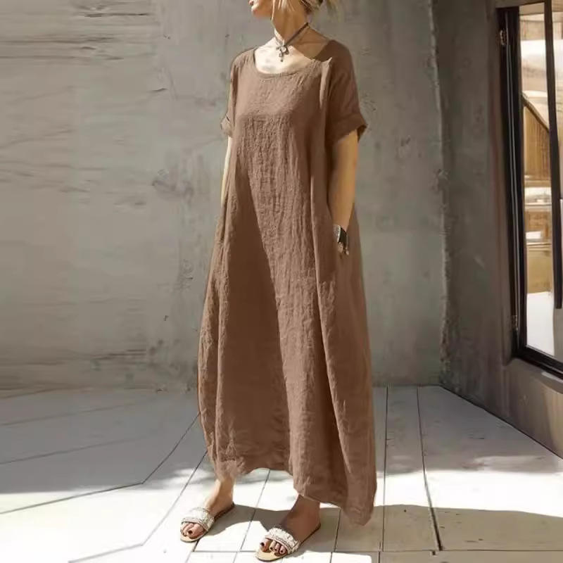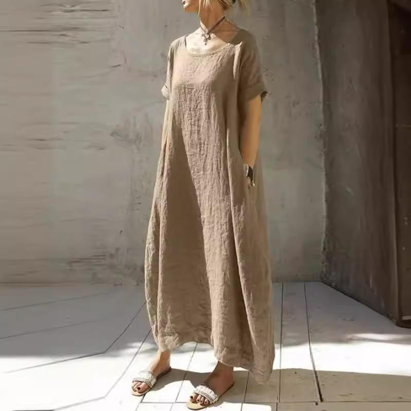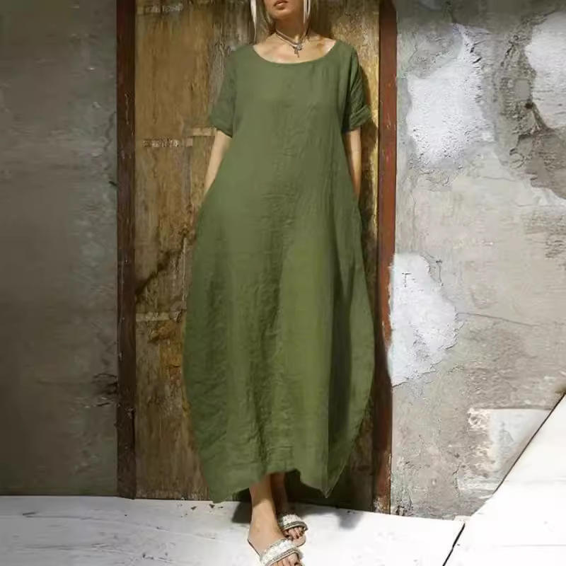 2025 cotton and linen women's loose large size solid color round neck short-sleeved waist belt split dress