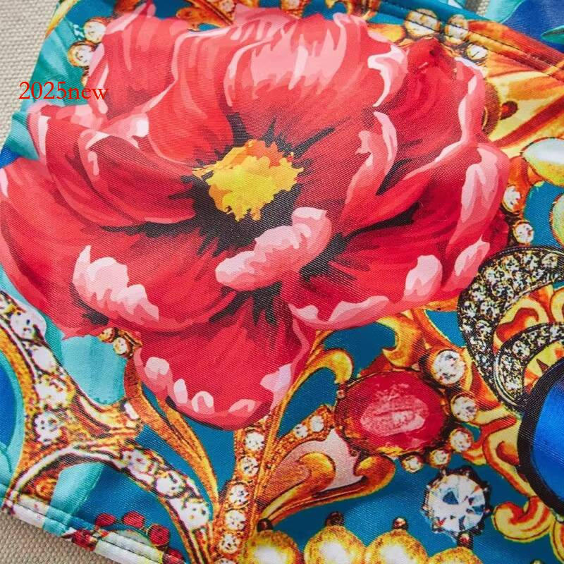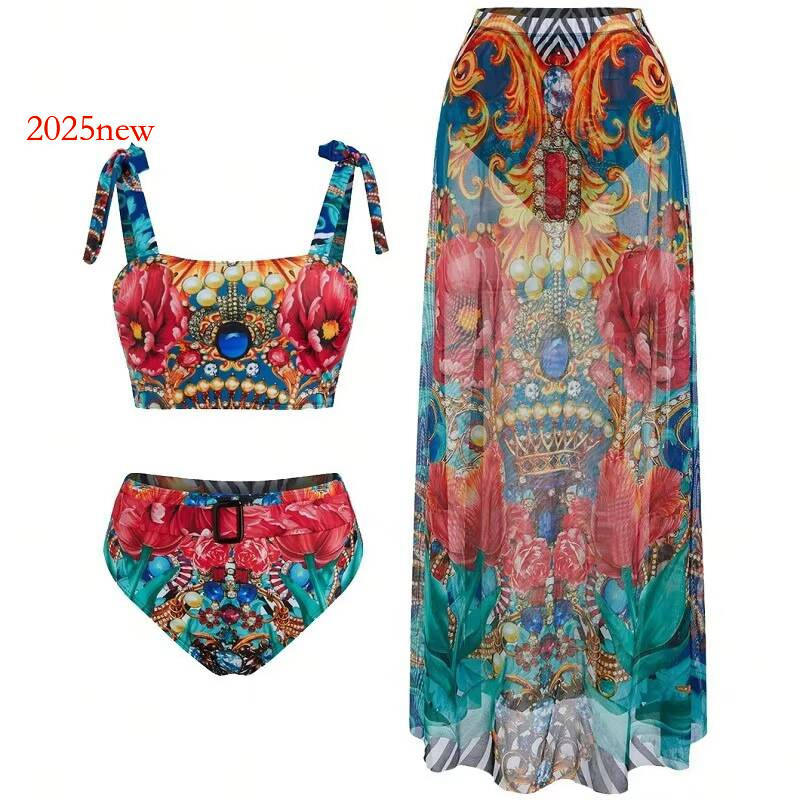 2025 hot 2024 Hawaiian Print Vacation Style Backless Strap Sun Protection Slimming Sexy Fashion Three-Piece Swimsuit for Women