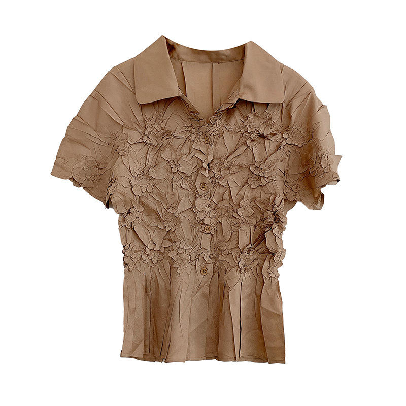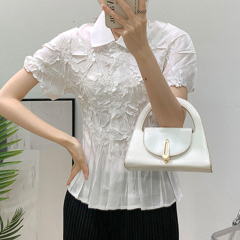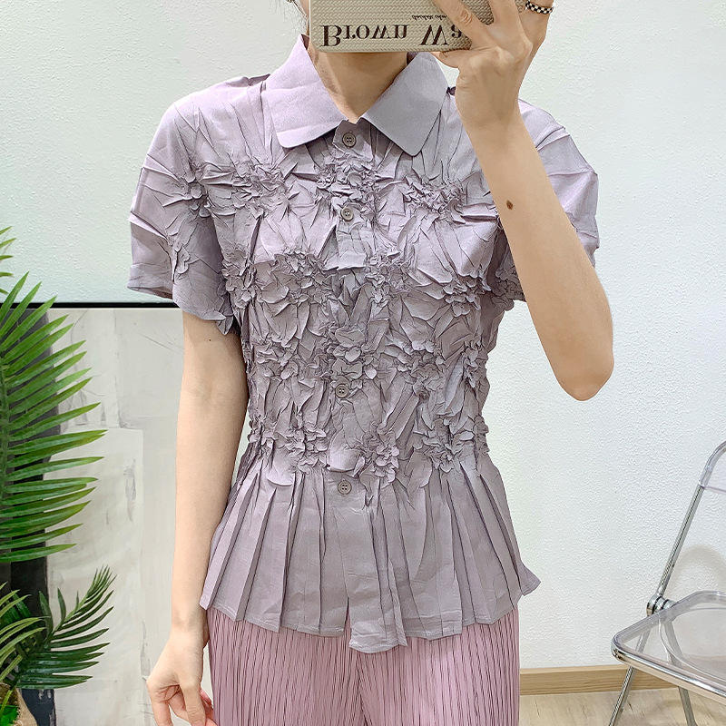 2025 summer new pleated short sleeved women's polo collar shirt fashionable casual slimming jacket short sleeved top
