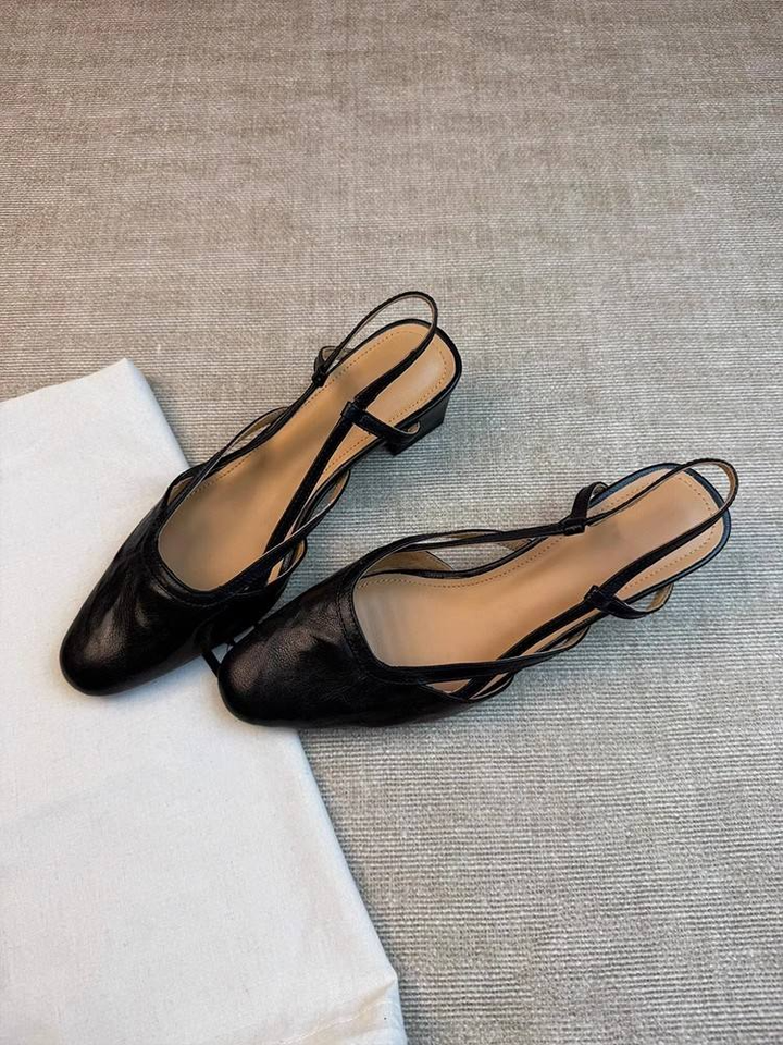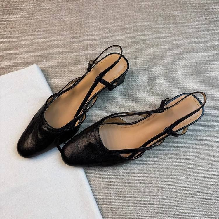 2025 woman with a retro and elegant style, wearing leather-wrapped sandals and a single, thick-heeled shoe on one foot