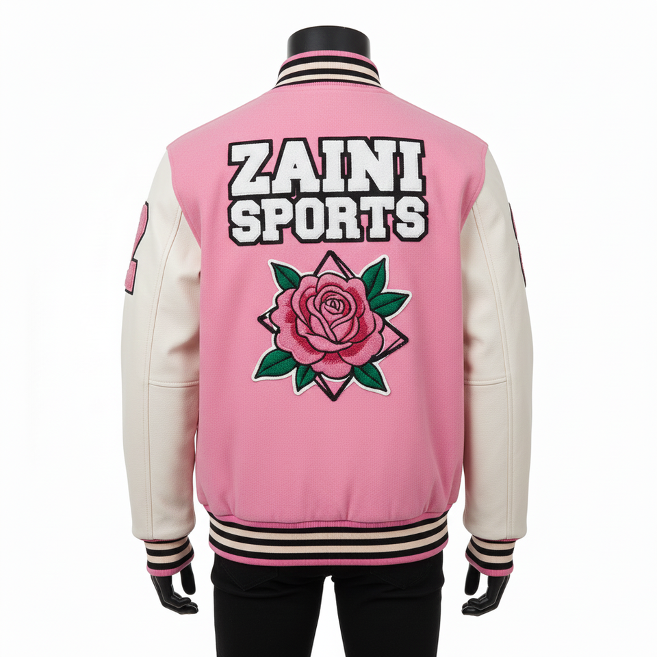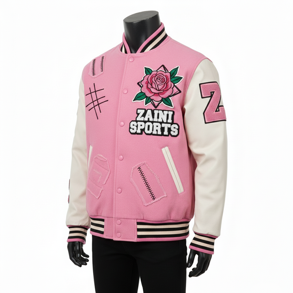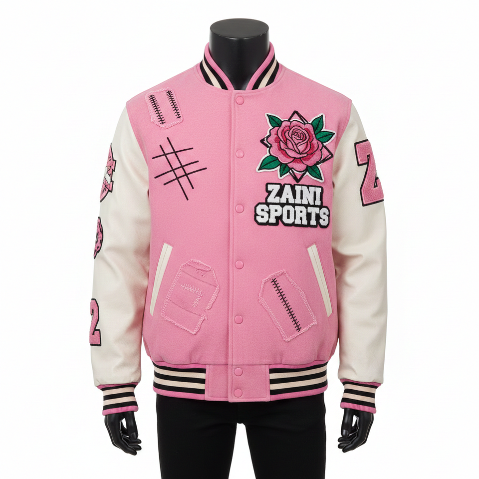 2025Men Varsity Jacket 330gsm wool blend body with white PU leather sleeves pink color panels embroidery patches Varsity Jacket