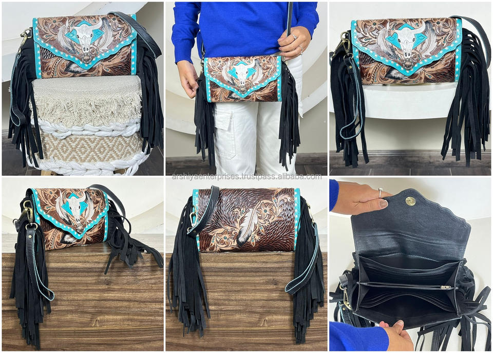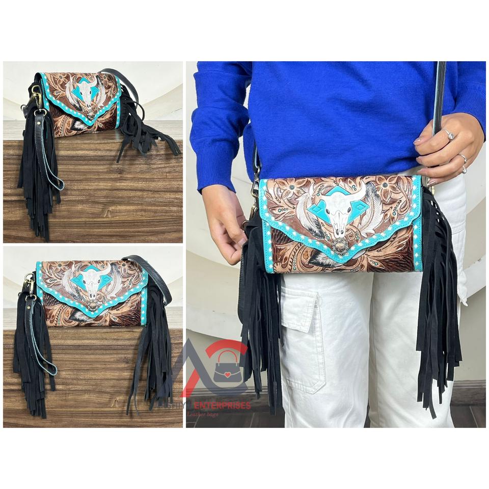 2026 Best Selling Hand Tooled Leather Luxury Designer Clutch Bag Premium Genuine Cow Leather Crossbody Fringe Mini bag for Women