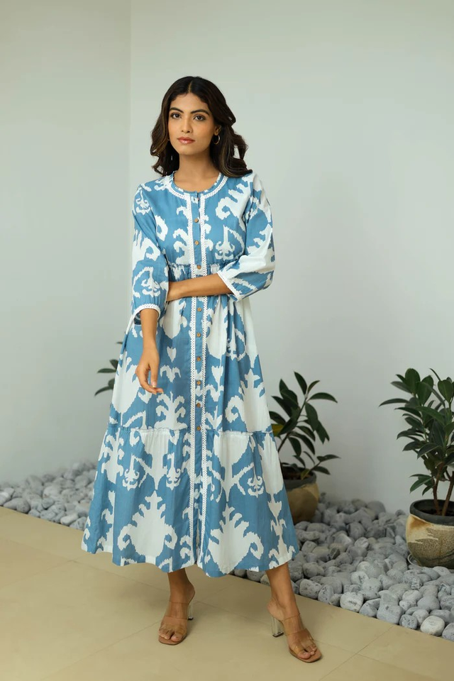 2026 Boho Ikat Print Cotton Maxi Dress Long Sleeve Tiered Button Down Dress for Women Long Sleeve Ethnic Dress