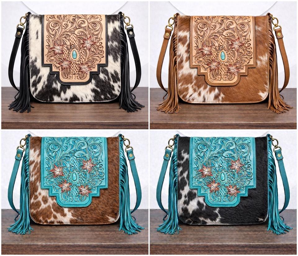 2026 Cowhide Fur Leather Handmade Carving Tooled Leather Fringe Handbag New Arrival Gypsy Boho Vintage Cross Body Stylish Bags