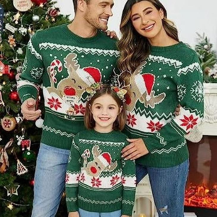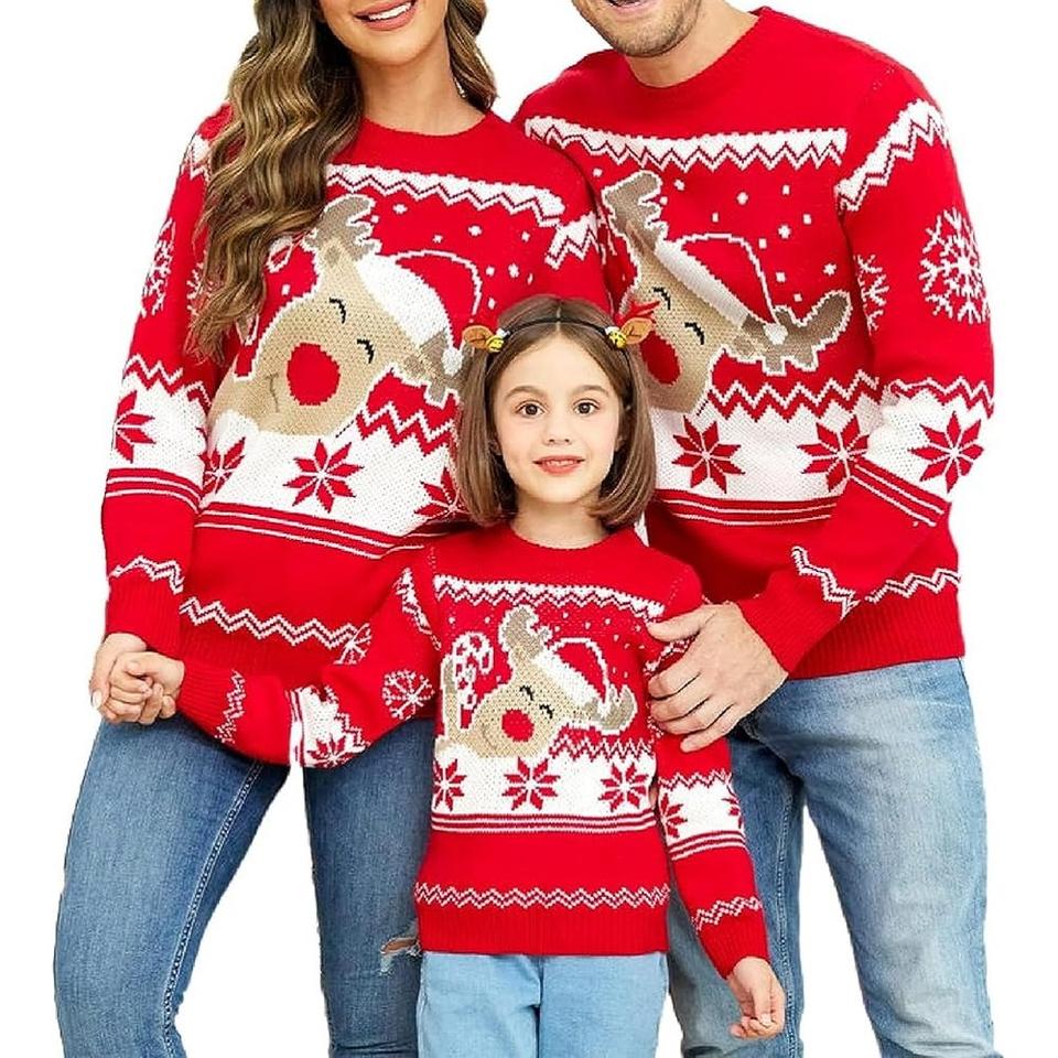 2026 Custom Knitted Organic Cotton Casual Winter Print Snowflakes New Year's LED Christmas Sweater with Funny Deer Design