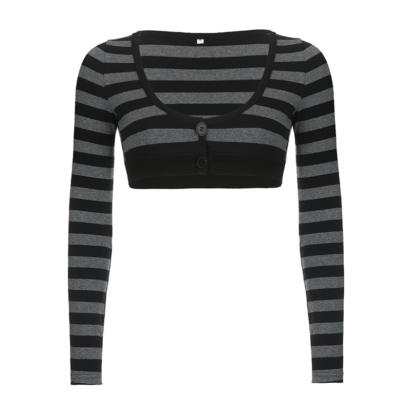 2026 Dark Punk Women Striped Button Crop T Shirt Gothic Short Sleeve Top Wholesale