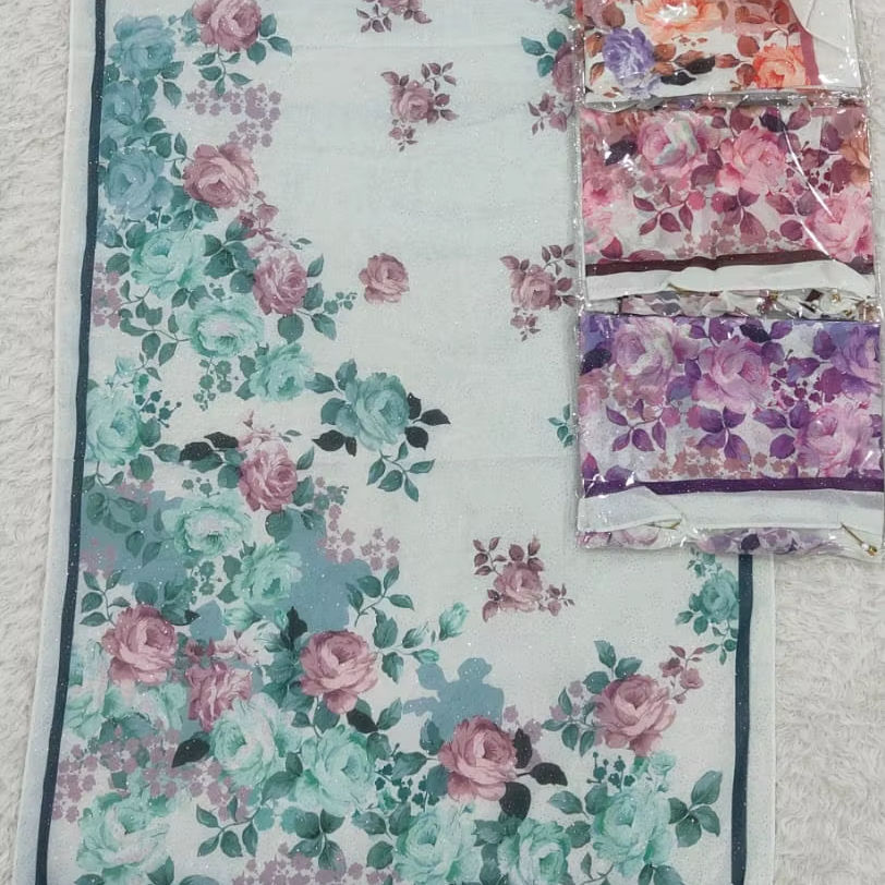 2026 Elegant Floral Print Linen Cotton Satin Hijab Set Lightweight Summer Scarf Tassels Shimmer Finish Multi-Color Rose Patterns