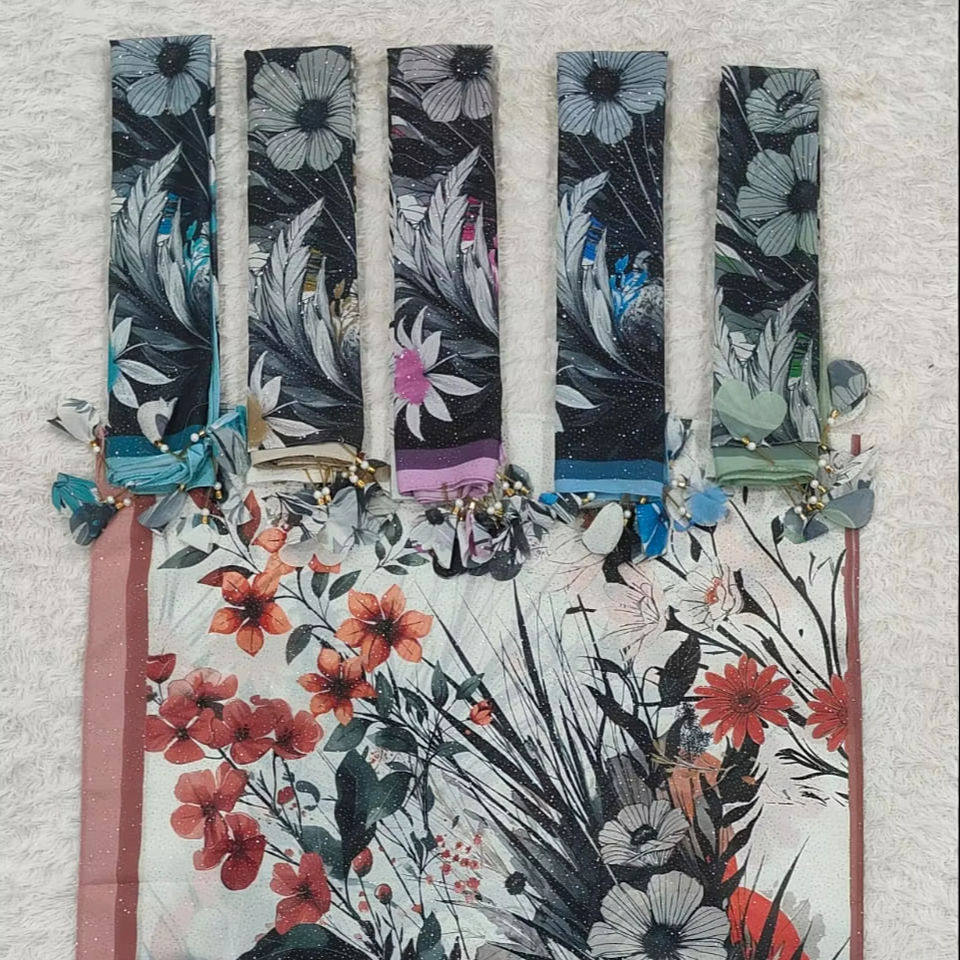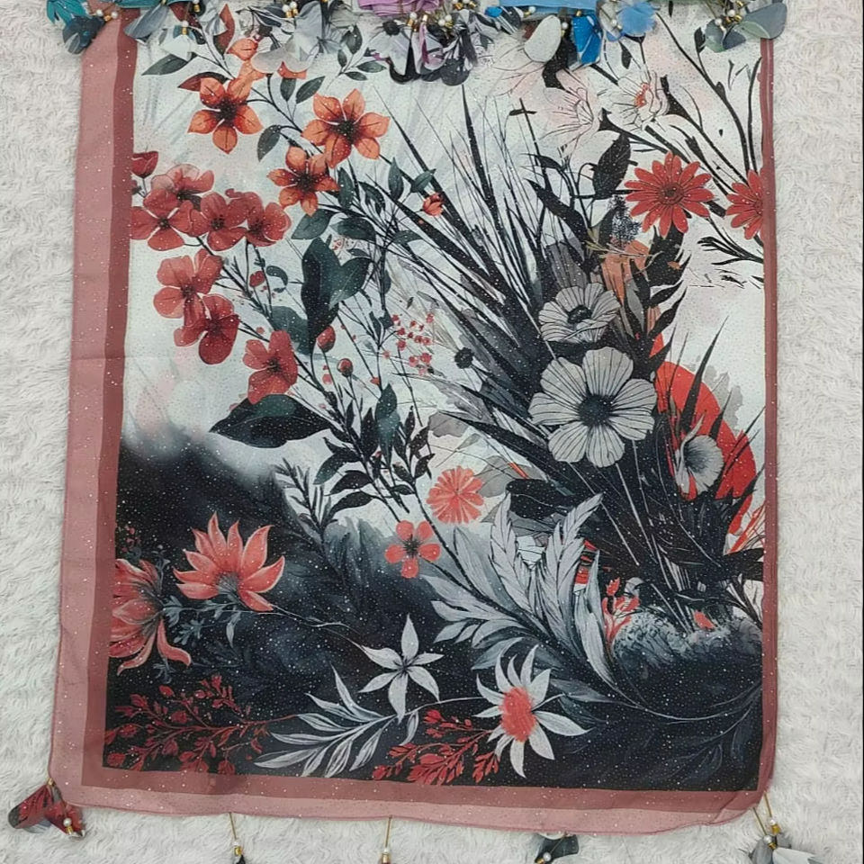 2026 Elegant Floral Print Cotton Linen Satin Hijab Set Lightweight Summer Scarf Tassels Shimmer Finish Multi-Color Rose Patterns