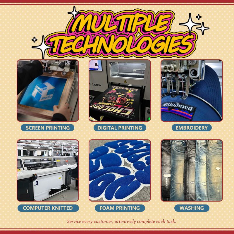 Printing Methods:Puff Printing, Heat-Transfer Printing, Digital Printing, Silk Screen Printing