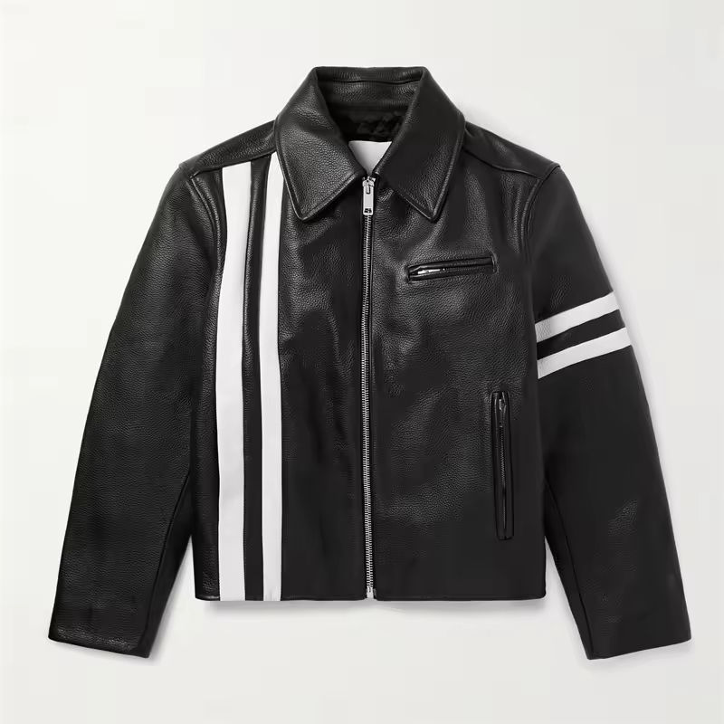 2026 High Quality Slim-Fit Zip Fastening Genuine Leather Varsity Jacket Men Attractive Striped Black Winter Motorcycle Jacket