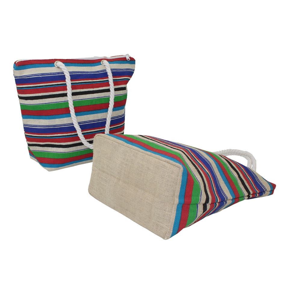 2026 Hot Design Jute Beach Bag Girls Allover Multi-Color Stripe Print Zip Closure Twisted Rope Handle Fashionable Cotton Leather