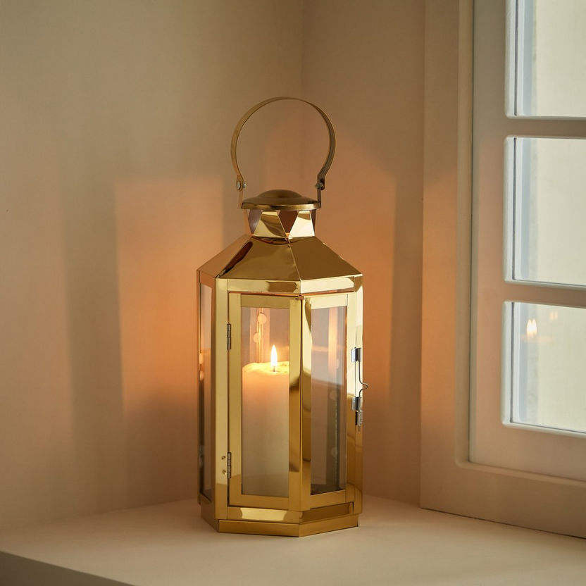 2026 Hot Sell Gold Hexagon Gold Plated Glossy Metal Candle Holder Lantern for Home Decorations