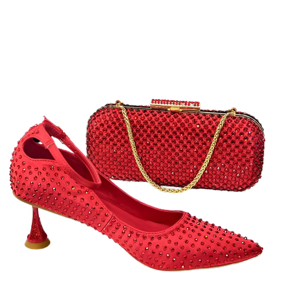 2026 Italian Luxury Beaded High-Heeled Shoes Crystal Rhinestone Flat Design Bridal Wedding Shoes Bag Set Red Summer Inmyshop