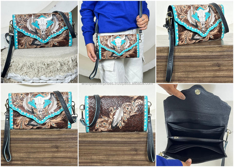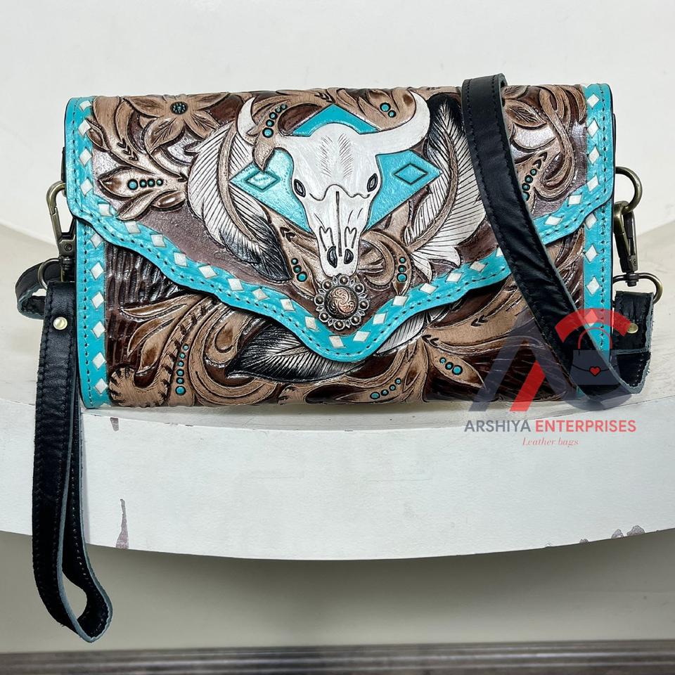 2026 March Expo Hand Tooled Cow Leather Mini Crossbody Bag Vintage Style Designer Skull & Floral Pattern Clutch Bag For Women's