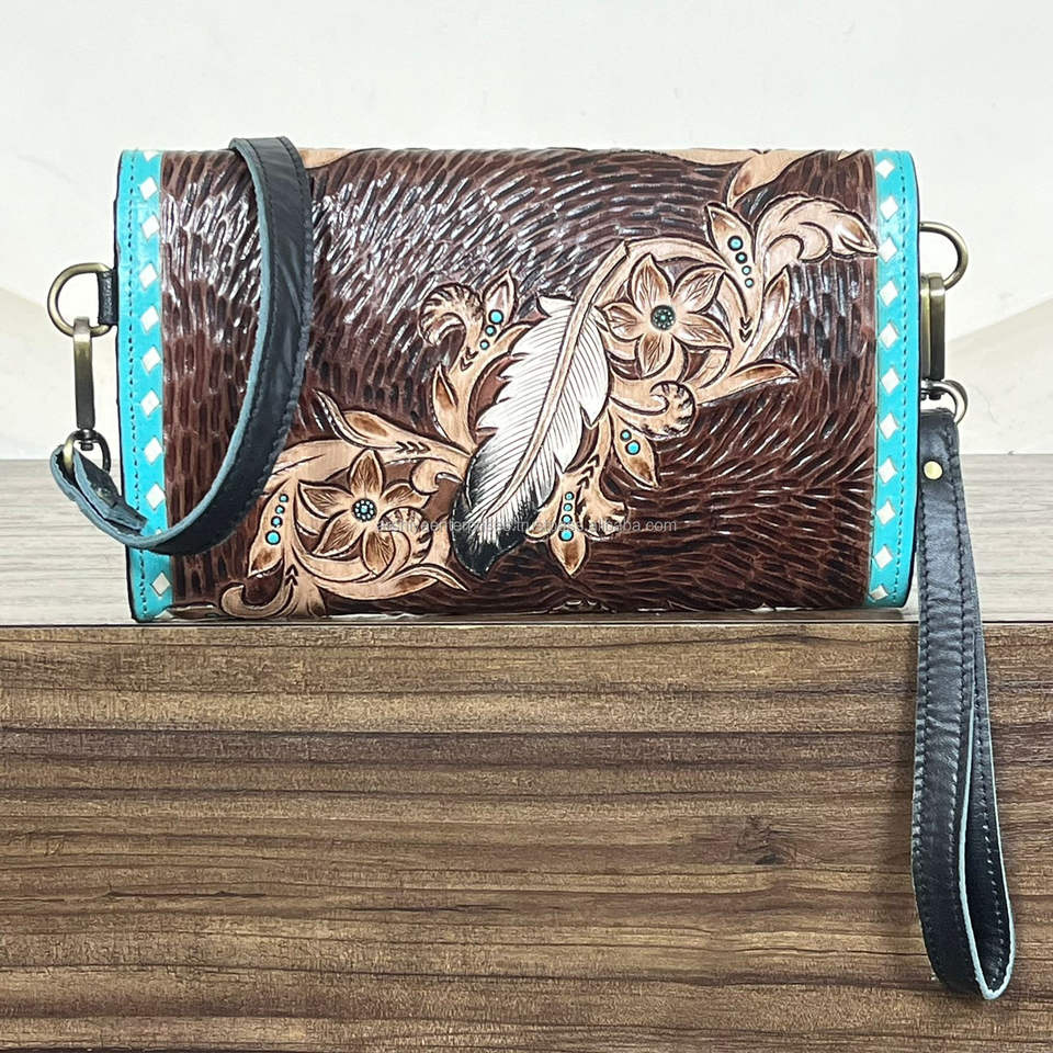 Product Name:Western Hand Tooled Floral Leather Crossbody Clutch
