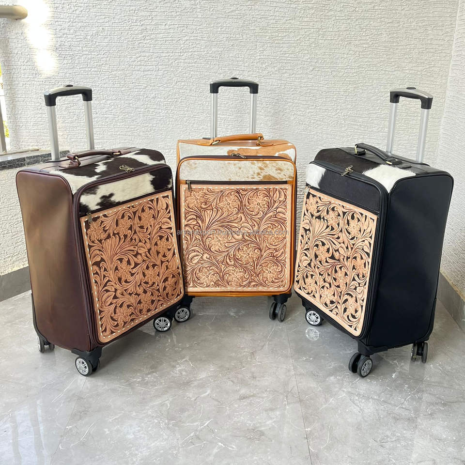 2026 March Expo New Luxury Real Genuine Hairon Leather Spinner Suitcases Western Floral Handcrafted Rolling Luggage Travel Bags