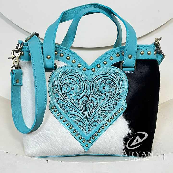 2026 March Expo Trending Turquoise Heart Shape Tooled Leather Tote Bags Premium Cowhide Leather Hand Carry Strap Fashion Handbag