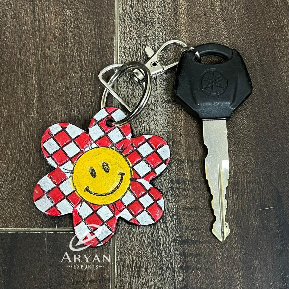 2026 March Expo Trendy Smiley Face Checkered Leather Keychain Clip Wholesale Handmade Genuine Leather Flower Bag Charm Keyring
