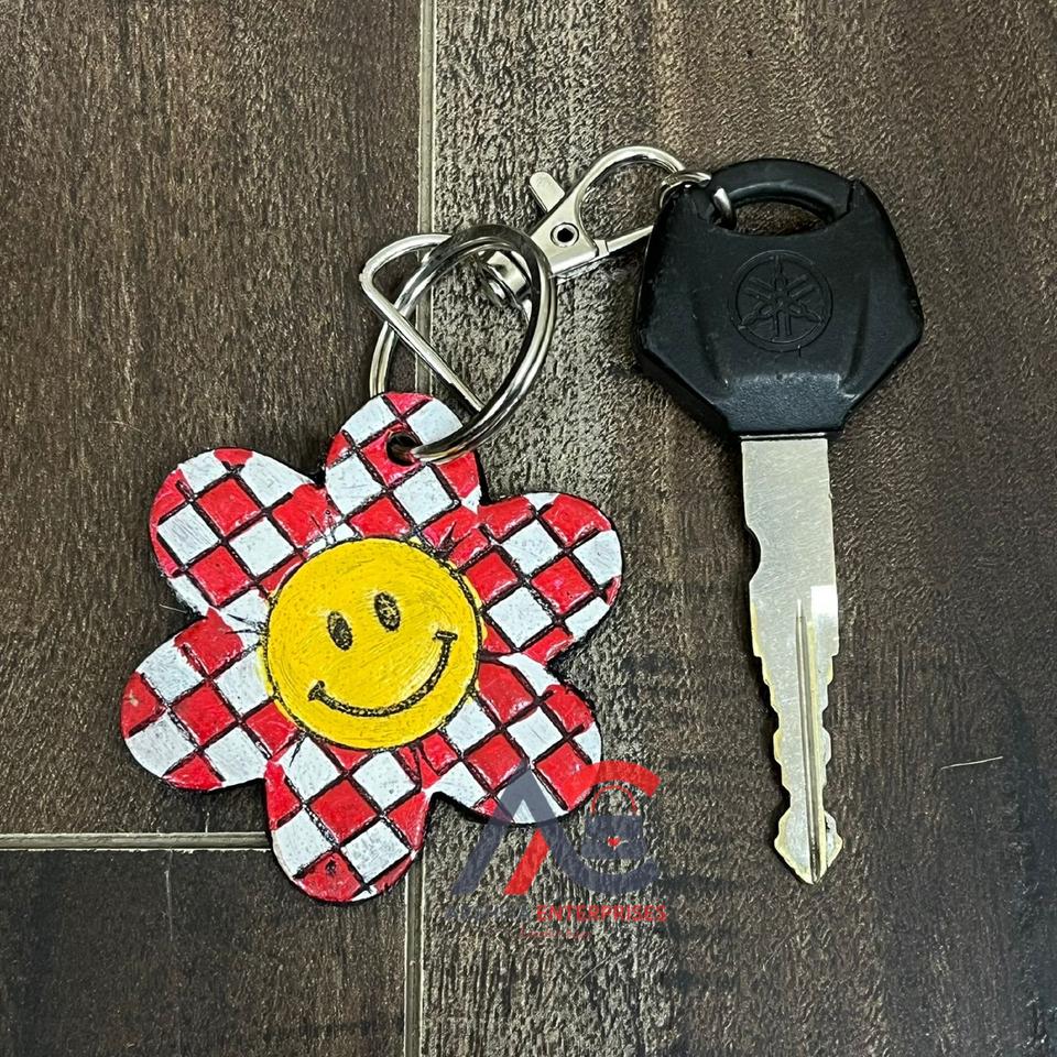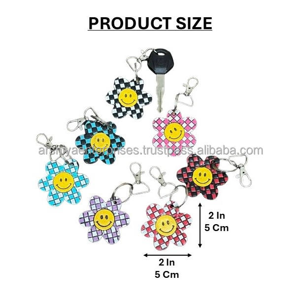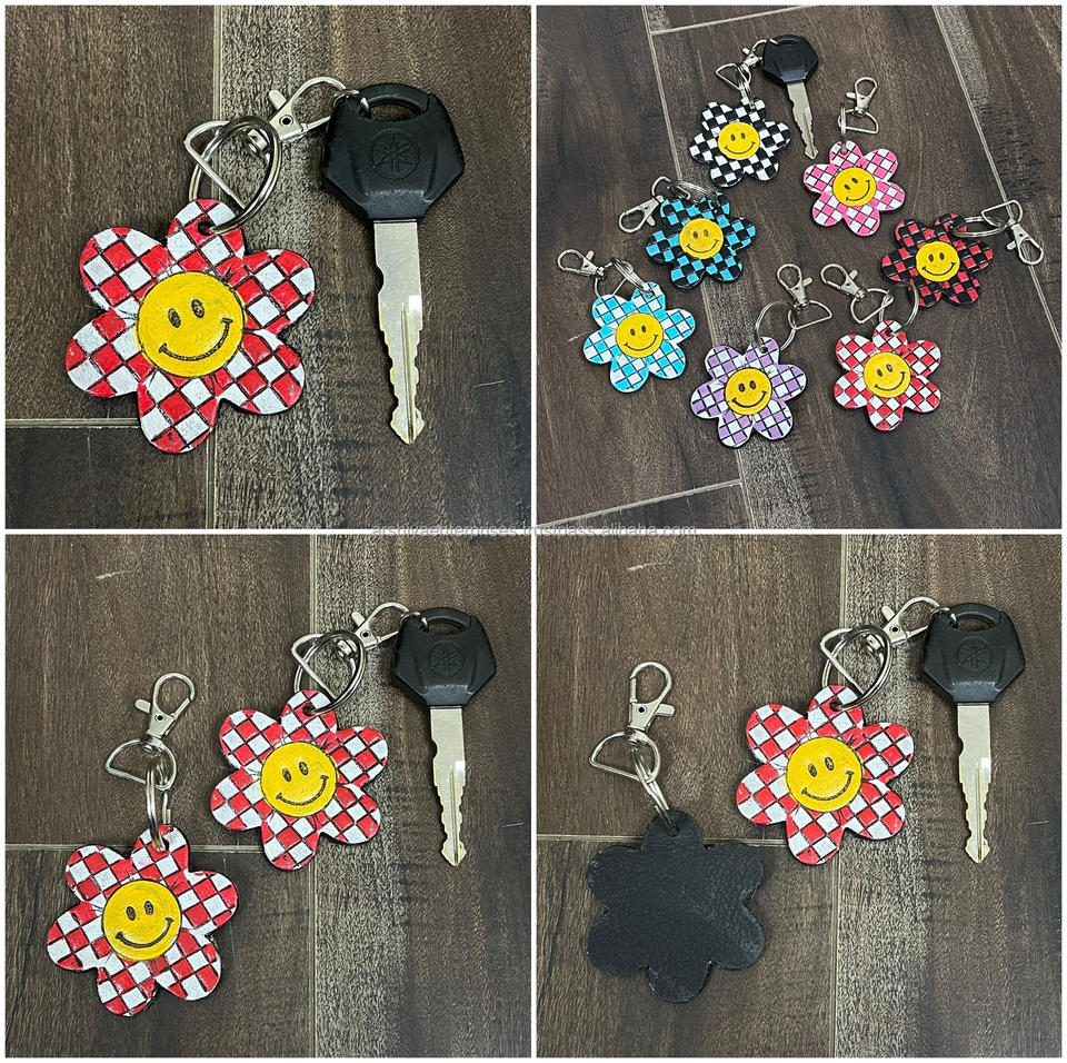 2026 March Expo Trendy Smiley Face Checkered Leather Keychain Clip Wholesale Handmade Genuine Leather Flower Bag Charm Keyring