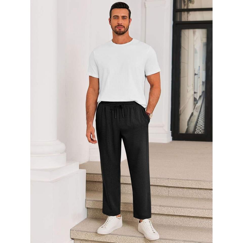 2026 Men's Casual Cropped Linen Pants 100% Cotton Elastic Waist Drawstring Pleated Lightweight Summer Yoga Beach Trousers