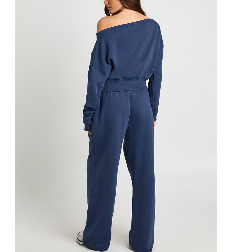 2026 Modern Women Off Shoulder Tracksuit Breathable High Quality Baggy Trouser Drawstring Closure Blue Solid Color 2PCS Set