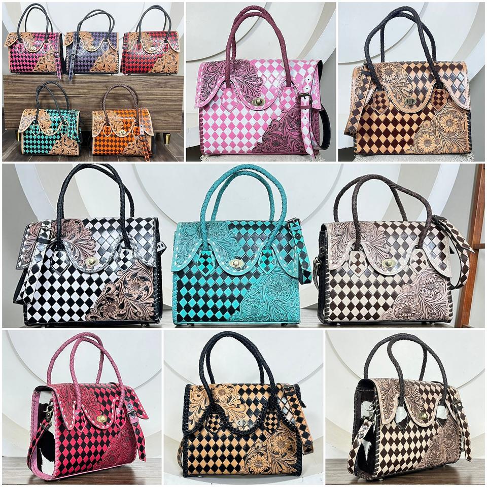 2026 New Elegant Hand Tooled Checkered Leather Women's Tote Bags Luxury Fashion Adjustable Strap Shoulder Bags for Women's Gifts