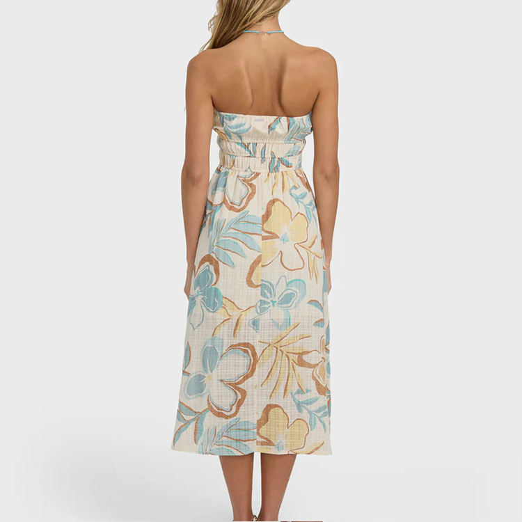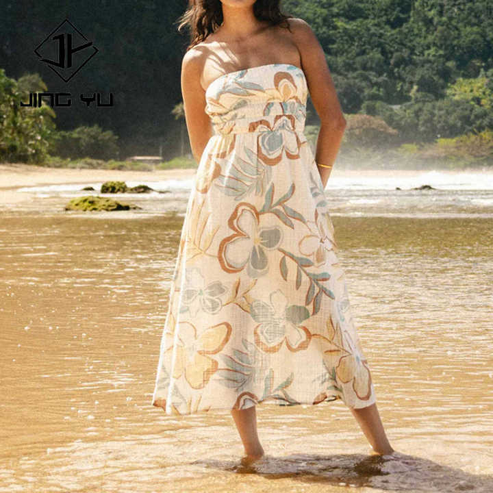 2026 New Seaside Print Pleated Strapless Women's Dress Custom Breathable COTTON GAUZE Casual Dress