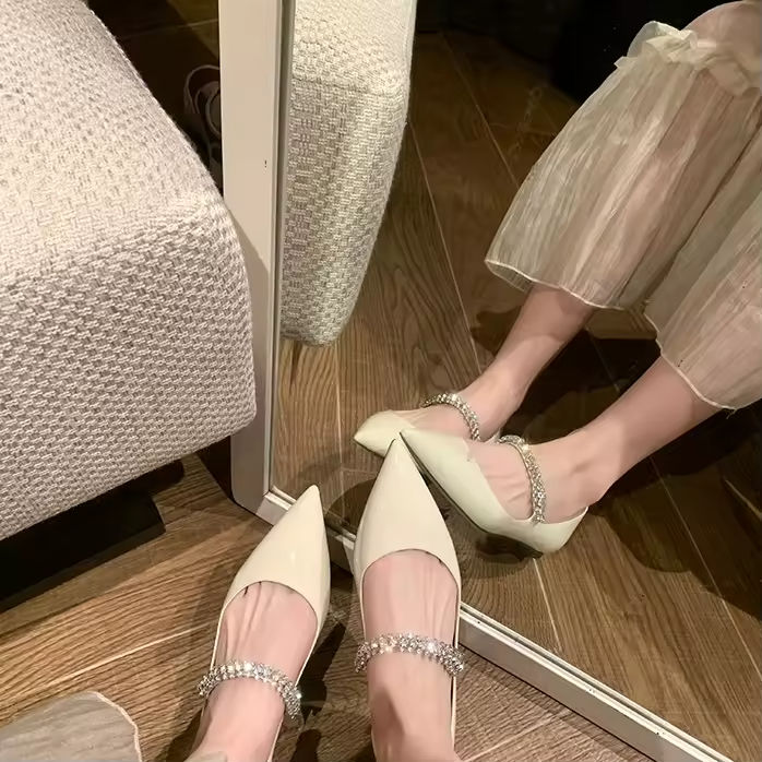 2026 New Style Genuine Leather Cow Leather Mesh Black Pointed-Toe Stilettos with Sandals for Women