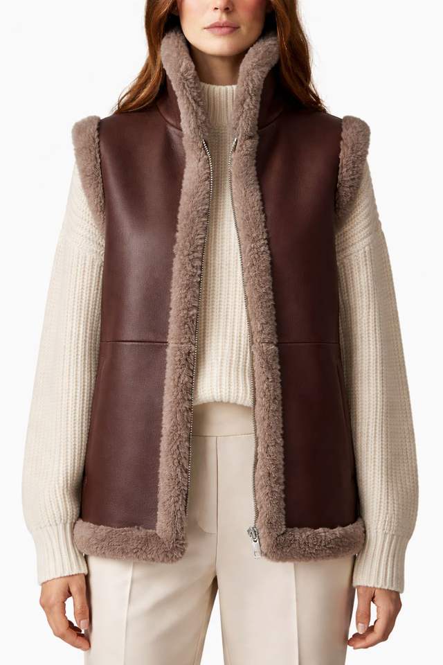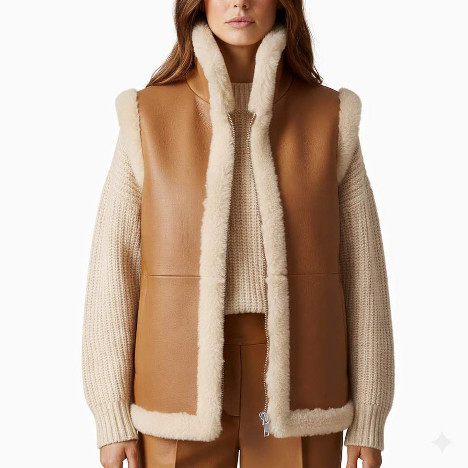 2026 New Style Women Brown Leather Faux Sueda Sherpa Lined Sleeveless Zip Up Vest Jacket