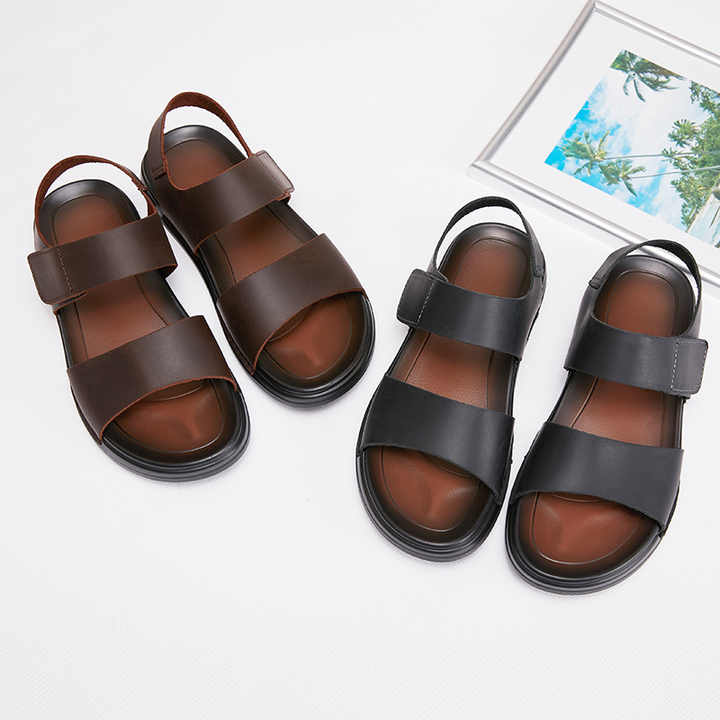 2026 New Summer Men Genuine Leather Velcro One Strap Sandals Breathable Cool Comfortable Casual Hand Stitched Men Shoes