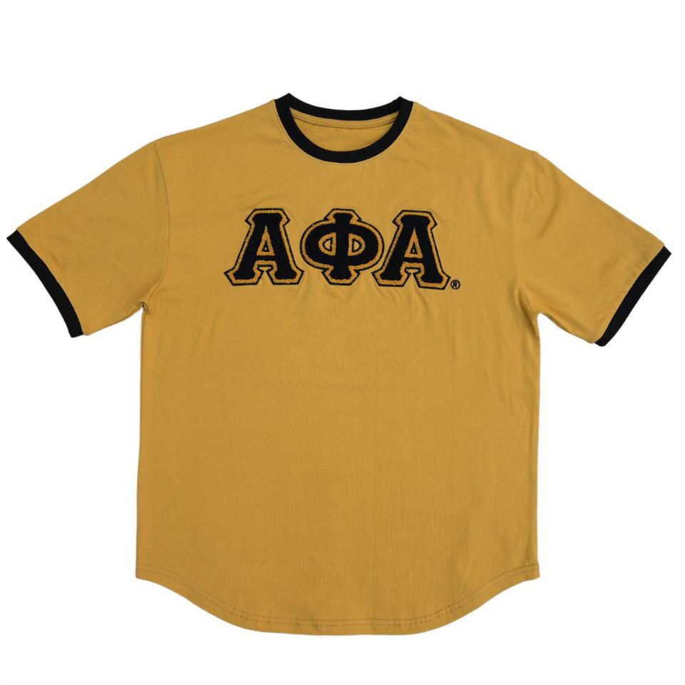 2026 Old Gold Cotton Premium Ringer T-Shirt Men's Fraternity Curved Hem Shirt With Chenille Embroidery Letters Greek Apparel