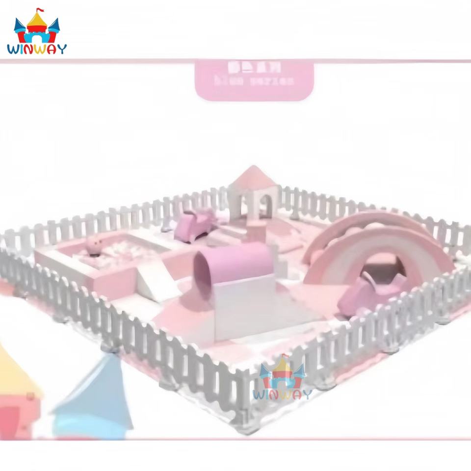 2026 Pink WINWAYTOYS Commercial Indoor Inflatable Soft Play Set Wooden PVC/PP Ball Pit Climber Tunnel Slide Hot Sale Amusement
