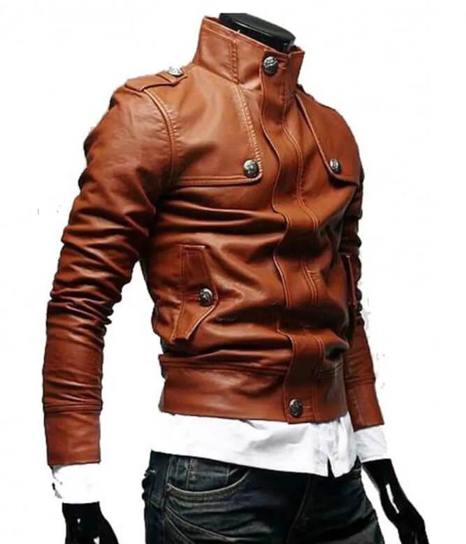 2026 Slim Fit Jacket Men's Brown PU Leather Jacket Stylish Stand Collar Motorcycle Coat with Button Details and Zipper