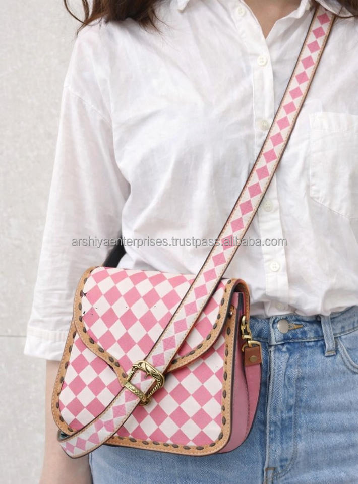 2026 Western Stylish Checks Design Gypsy Boho Handbags Premium Leather Handcrafted Pink & White Checkered Women's Messenger Bags