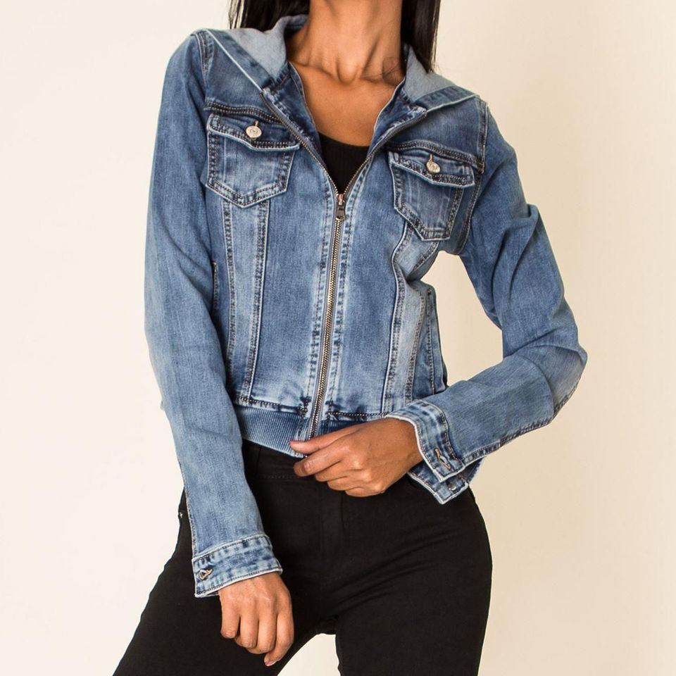 2026 Wholesale Price Women's Cropped Denim Jacket Casual Outwear Wool Lining Blue Long Jean Jacket Cotton Printed Fabric Coat