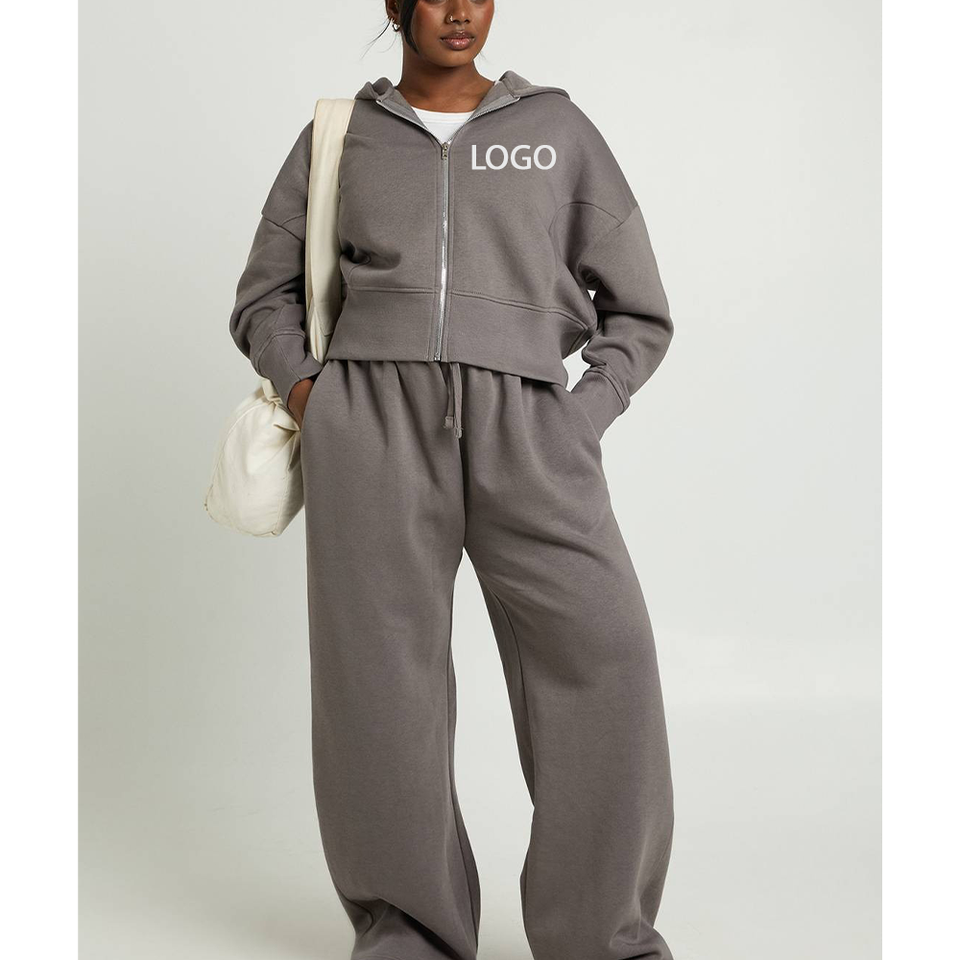 2026 Women Sports Tracksuit 2Pcs Set Hip Hop Fashion Zipper Jacket& Wide Leg Joggers Cotton Polyester Lightweight Sweatsuit