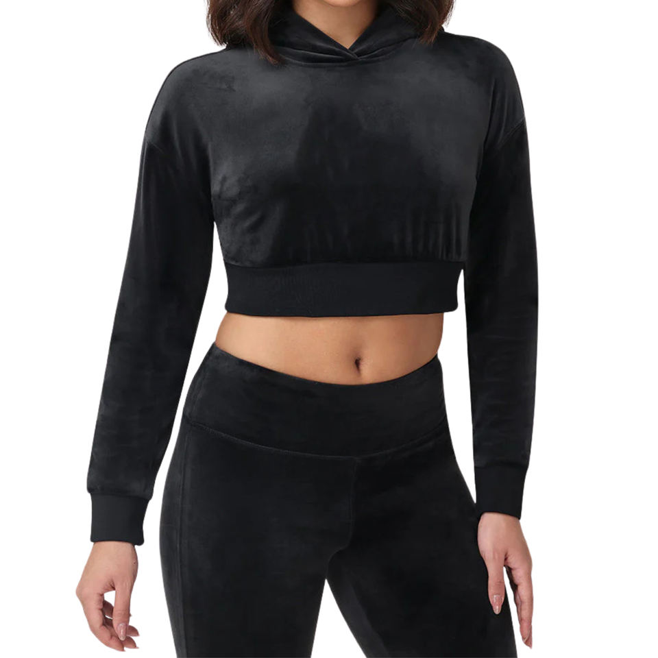2026 Women's Cropped Hoodie Heavyweight Velour Acid Wash Lined Plain Black Pullover Sweatshirt Elastic Hem Custom Logo Solid