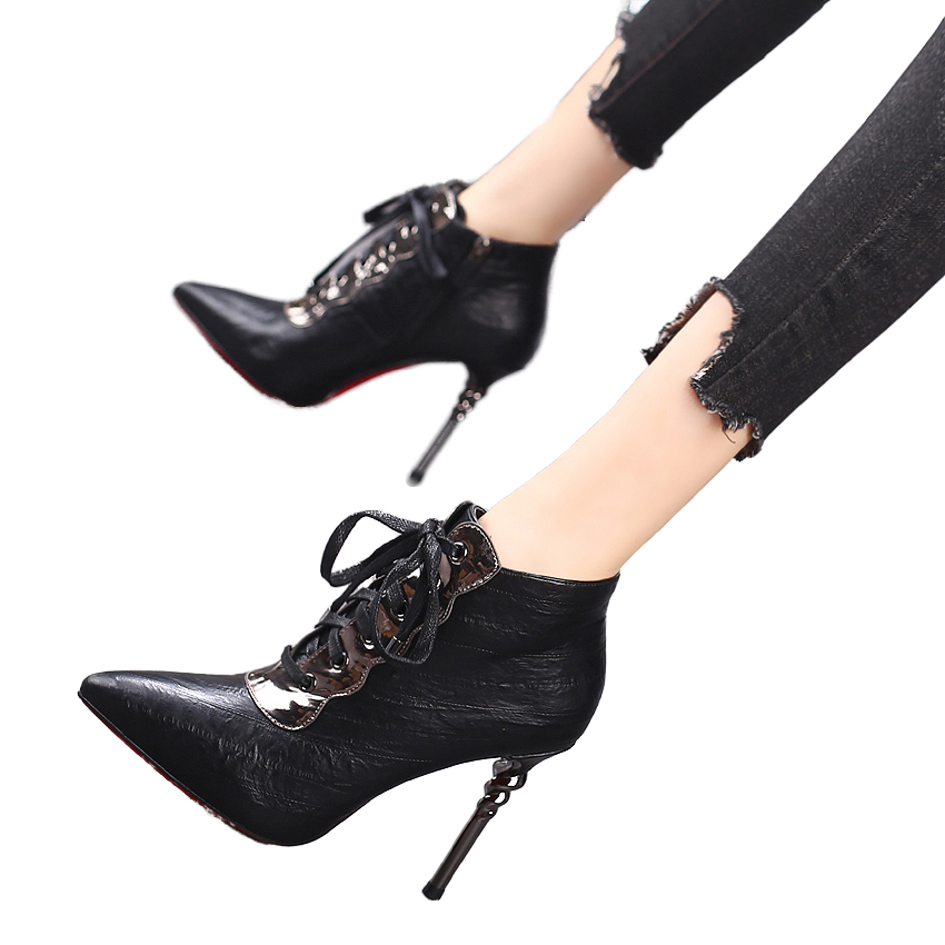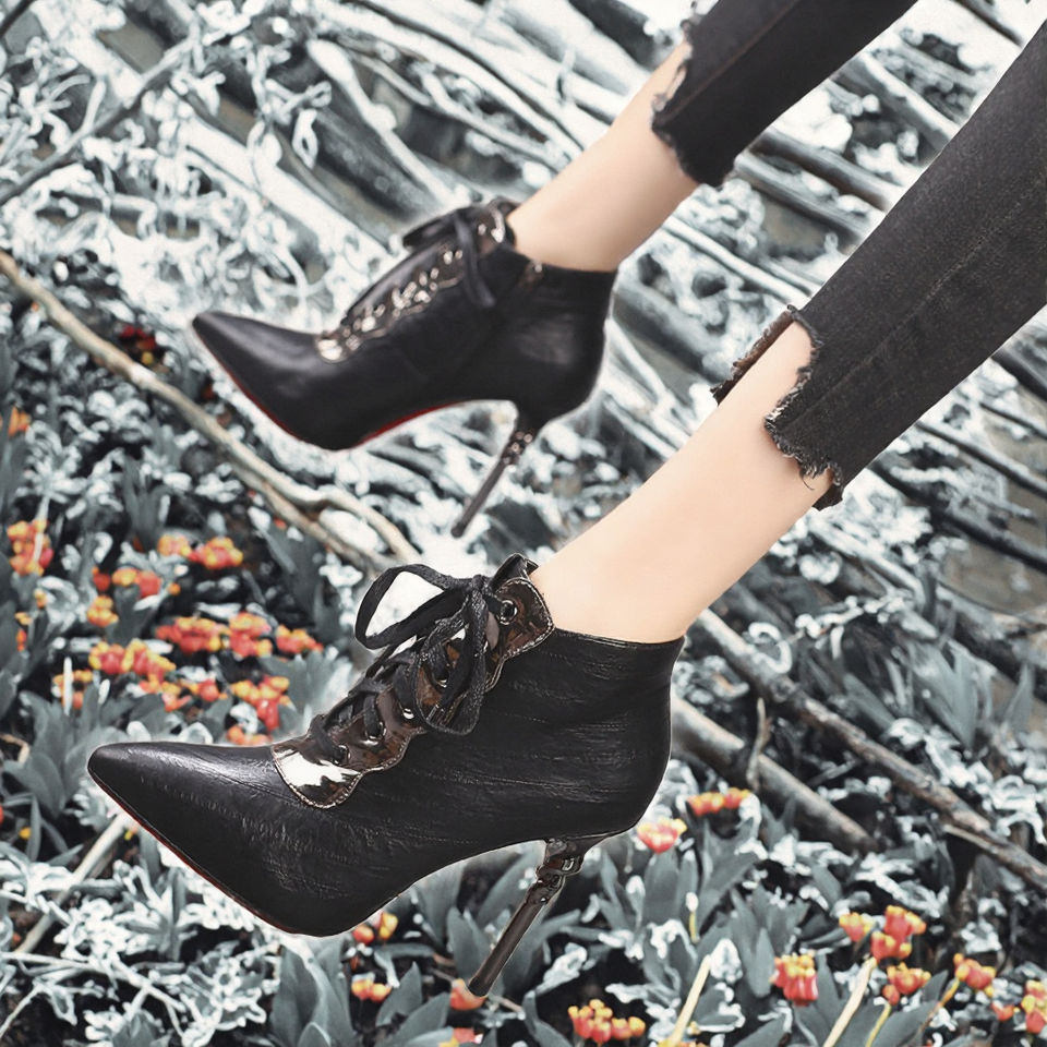 2026 Women's High-Heeled Ankle Boots New Stiletto Pointed Toe for Martin Design Lace-up Net Breathable Red Short Spring Autumn