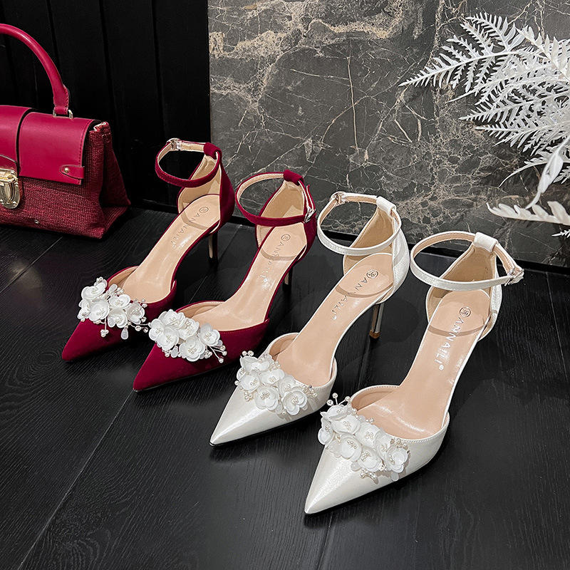 2026 satin white open-cut single-strap floral wedding high heels two-way wear bridal shoes for both Xiuhe and wedding dress