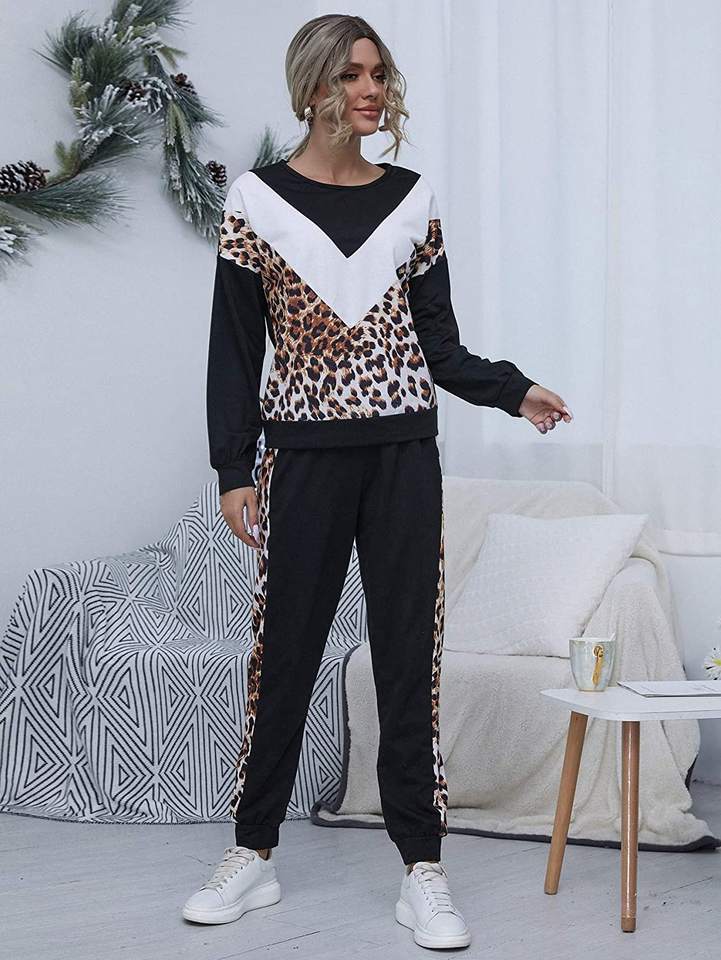 2026 women color blocked leopard printed patchwork tracksuit custom crewneck sweatshirt& joggers running lightweight 2 piece set