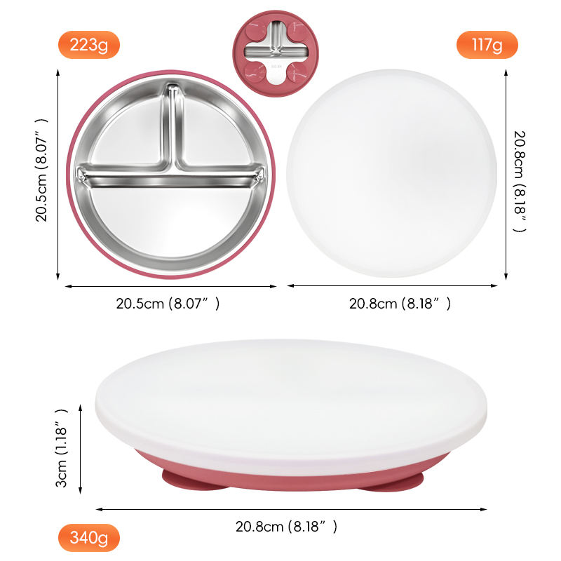 20cm Diameter Stainless Steel Manual Dining Plate with Bottom Suction Cup and Silicone Cover BPA-Free for Toddler