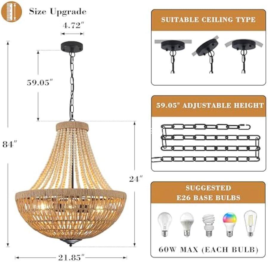 22" Wood Beaded Farmhouse Pendant Light Fixtures Bohemia Hand-Woven Rattan Chandeliers for Dining