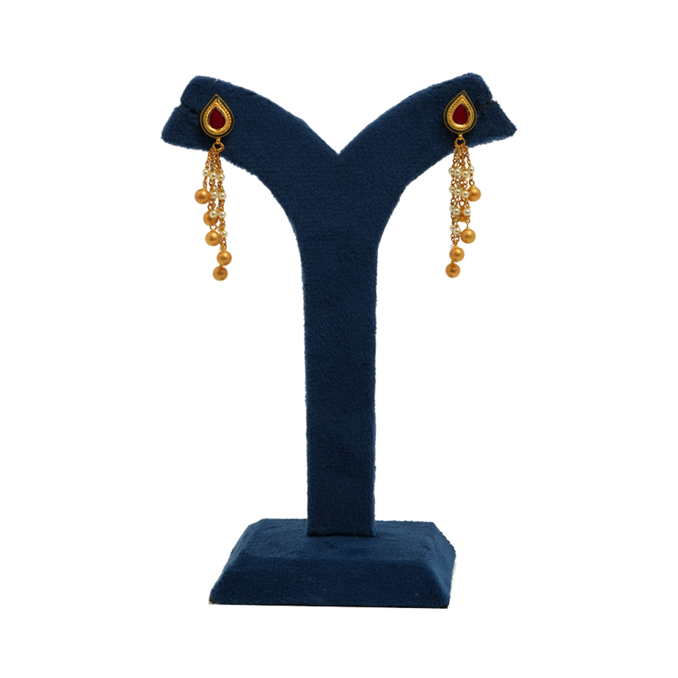 22K Fine Gold Teardrop Earrings with Red Stone & Pearl Chains Handmade Long Dangle Earrings Luxury Indian Bridal Gold Jewelry
