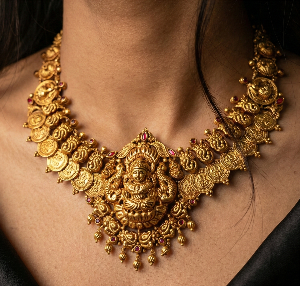 22K Solid Gold Temple Necklace Set | Traditional Indian Bridal Jewellery | Antique Finish Handcrafted Gold Haram