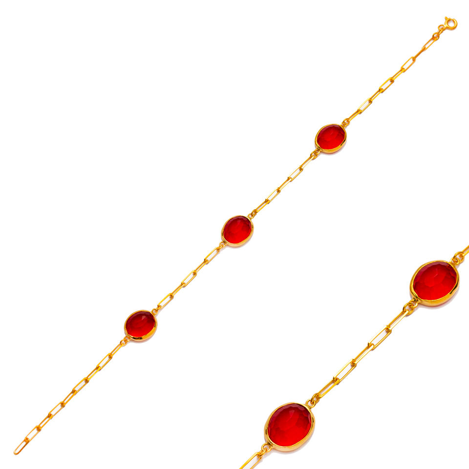 22K Gold Bezel Charm Bracelet with Ruby Quartz Triple Stone Handcrafted 925 Sterling Silver Jewelry Fine Chain Link Wholesale J