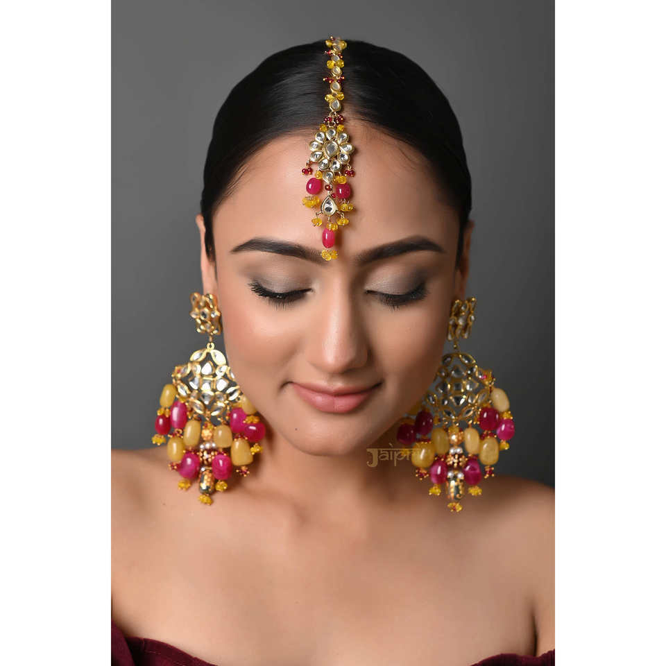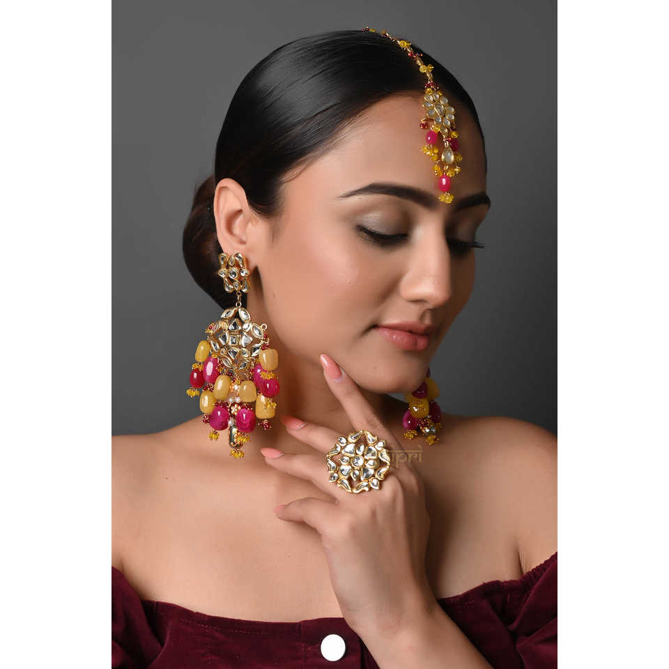 22k Gold Plated Kundan Earring Tikka and Ring Set Free Size Fine Jewelry Sets