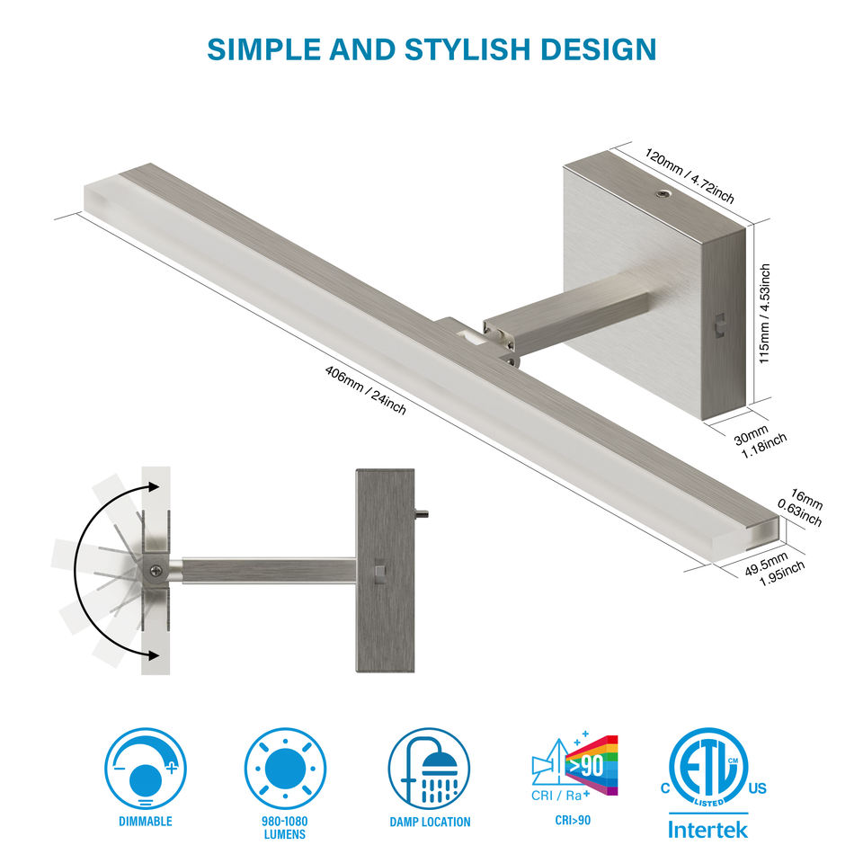 24 Inch LED Vanity Light Adjustable Modern Bathroom Vanity Light Fixtures Over Mirror