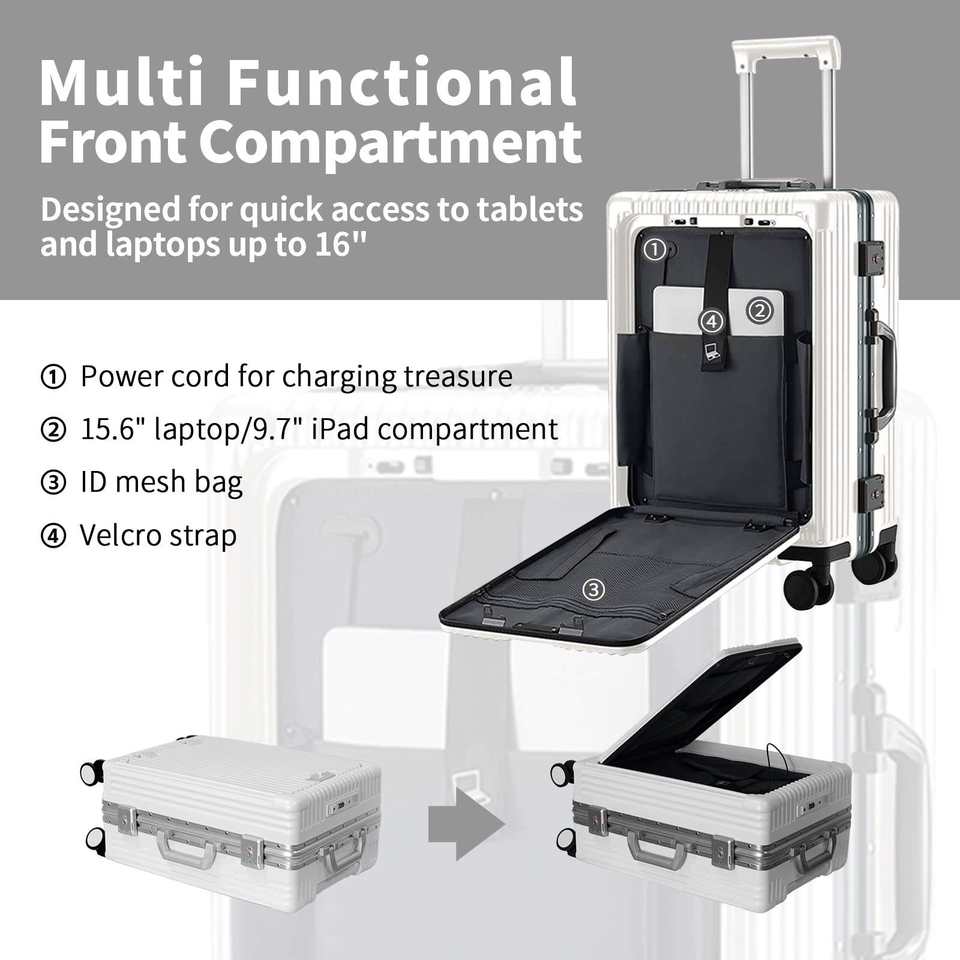 24 inch luxury luggage with aluminum frame, USB charging port, TSA lock cup holder, luggage compartment