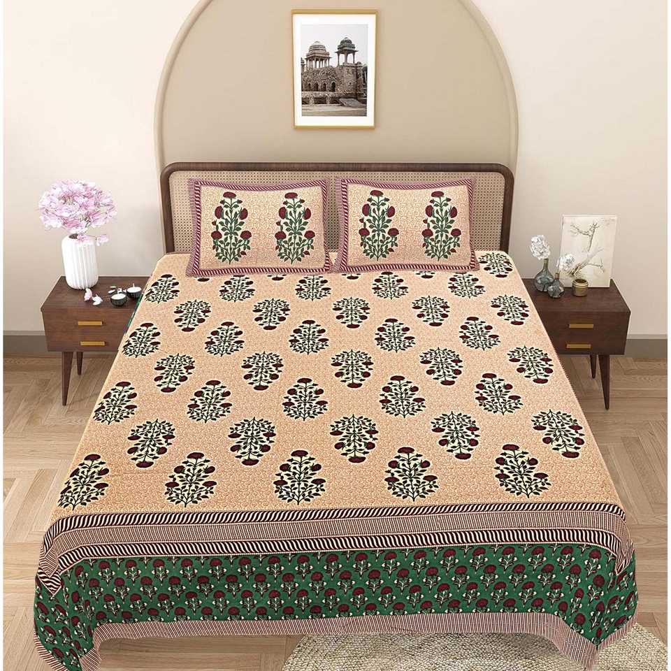240 TC Green Floral Cotton 1 Super King Size Bedsheet with 2 Pillow Covers 3-Piece Set (SHKV1079)