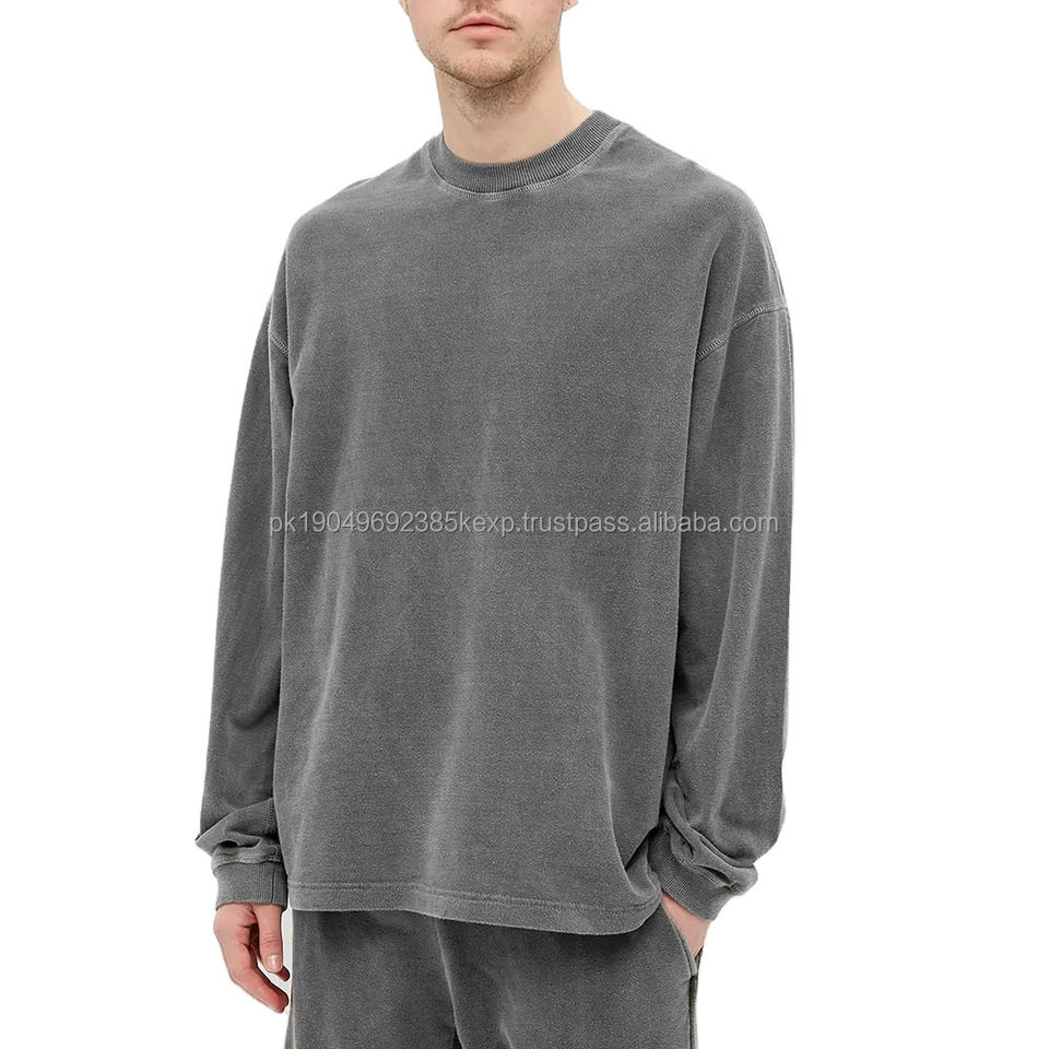 240gsm Contrast Stitch Faded Black Retro T-shirt Oversized Long Sleeve Crew Neck Tee Vintage Washed Distressed Men's Sweatshirt